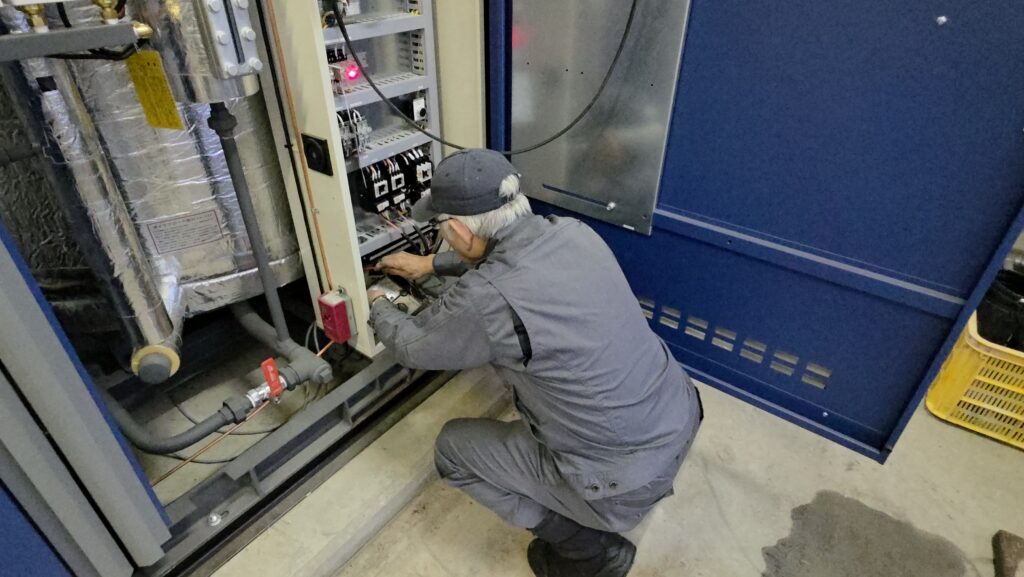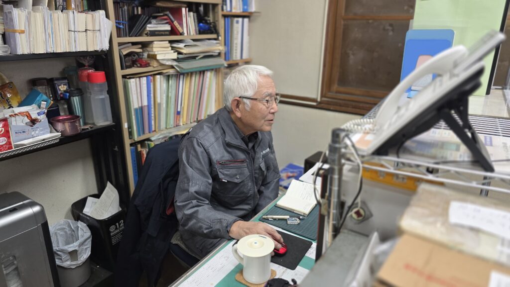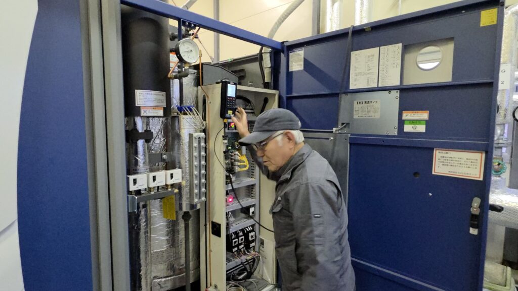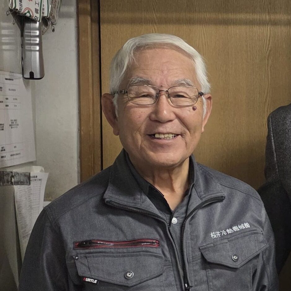 現在、桜井冷熱機械㈱中央支所の参事として若手社員を指導しつつ、現役でボイラー整備などを行っている。